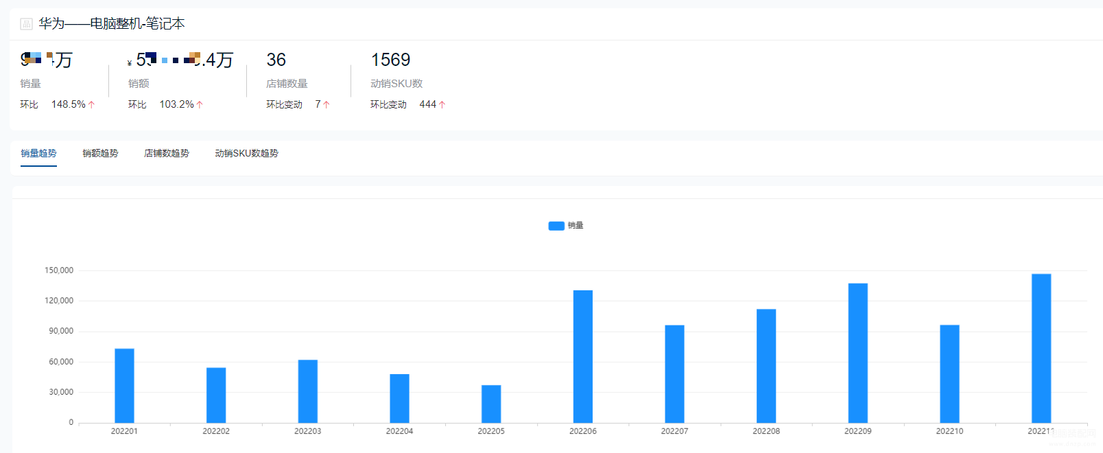 华为今年整体的排名是第二名,仅次于联想。2022年全年华为笔记本的总销量超99万台,总销售额超53亿元。2022年11月份,华为的销售成绩达到全年最高峰,单月销量超14万件,销售额超7.5亿元。目前,京东平台上有华为笔记本相关店铺36家,每个月的动销sku数量达1569个。