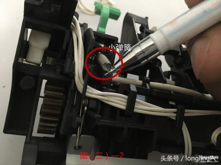 (二)把定影组件翻一面,在兰色压力栏下,拆下两个弹簧,见图(三),注意在拆另外一个时,还有一个小弹簧,别丢了(图(三)—2。