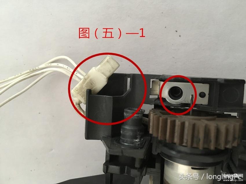 (四)接下来,拆下左右两边两个白色塑料接头,小心取出定影加热辊。见图(五)、图(五)-1、-2