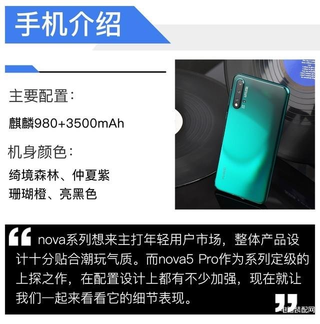 首先,我们先简单看下nova5 Pro的参数,nova5 Pro采用了一块OLED屏幕,屏占比高达91%;在nova拿手的自拍上,nova5 Pro的采用了目前华为最强的前摄配置——f/2.0光圈的3200万像素前摄镜头,后置镜头则进一步升级为后置四摄;性能上则采用了目前华为最强的麒麟980处理器,综合来看性能十分强大。