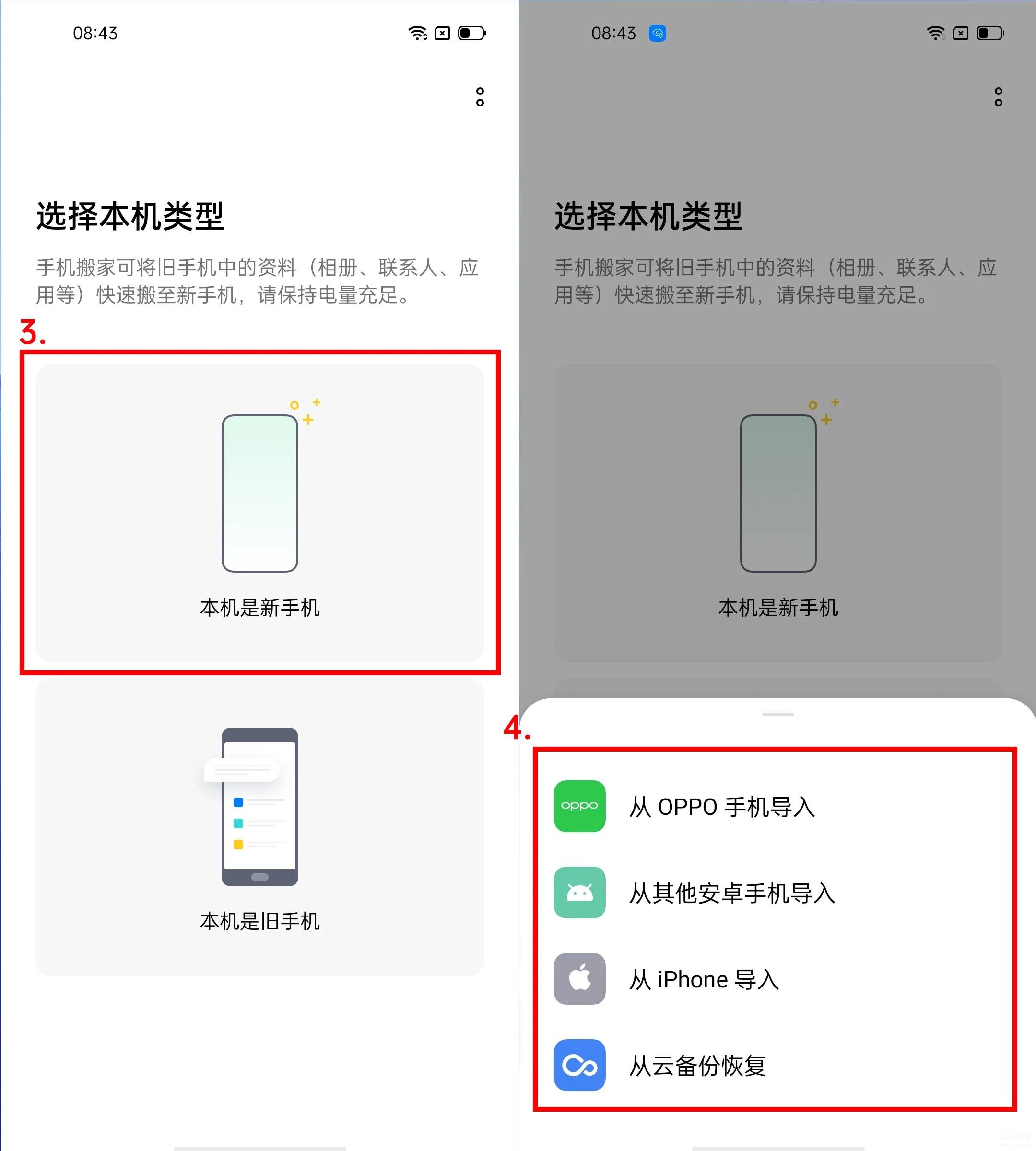 4、如果旧手机是OPPO手机,则在新手机上点击“从OPPO手机导入”。点击后就会出现一个二维码。