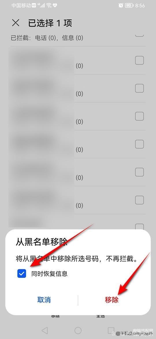 勾选“同时恢复信息”,点击“移除”即可将已拉黑的手机号拉回。