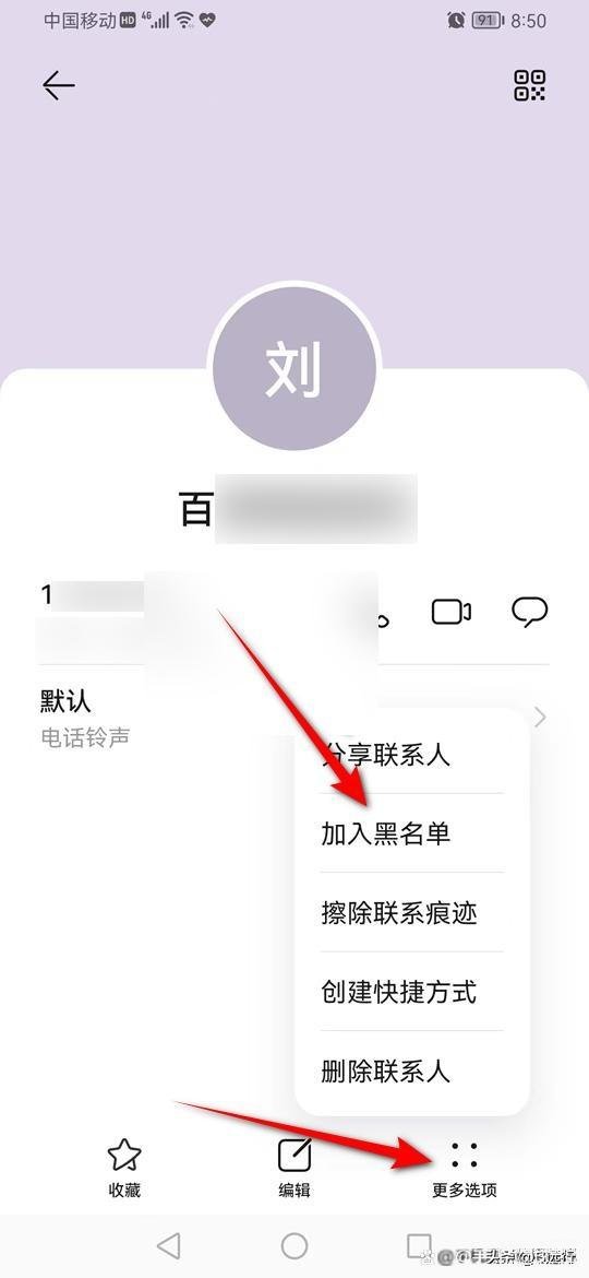 点击“更多选项”-“加入黑名单”即可将该手机联系人加入黑名单。
