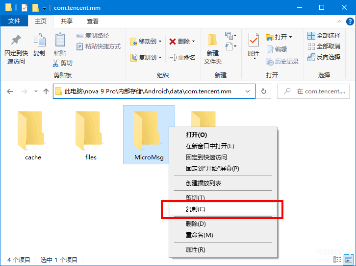 说明:如果该MicroMsg文件夹特别大的话,也可在手机上的“文件管理”app中,对该文件夹进行压缩后再导出到电脑上来。