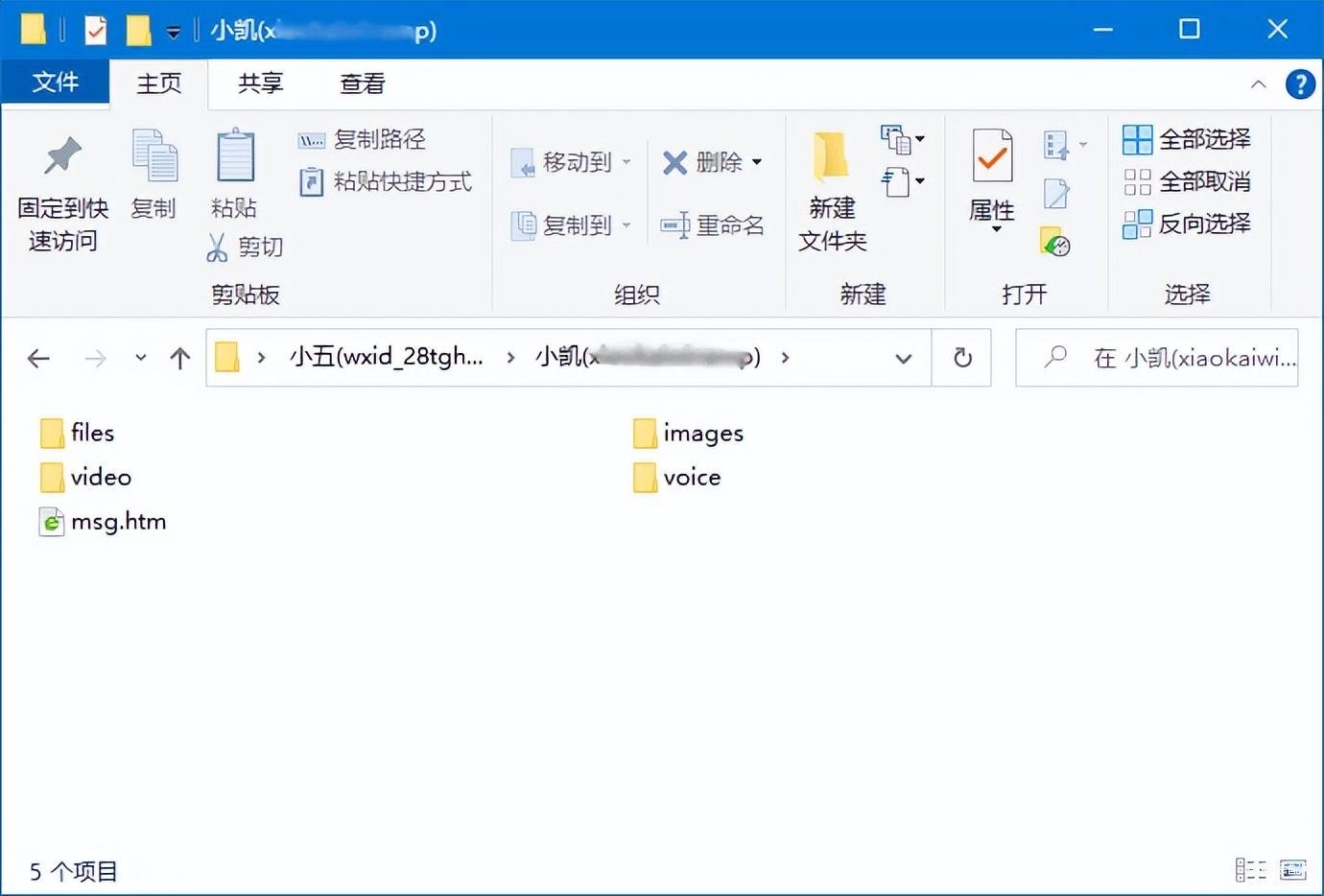 15,导出目录下的文件结构如下图所示,其中files中保存了所有收发的文件,images中保存了所有收发的图片,video中保存了所有收发的视频,voice文件夹中则保存了所有收发的语音消息,msg.htm中则可以查看到所有这些导出的聊天记录。
