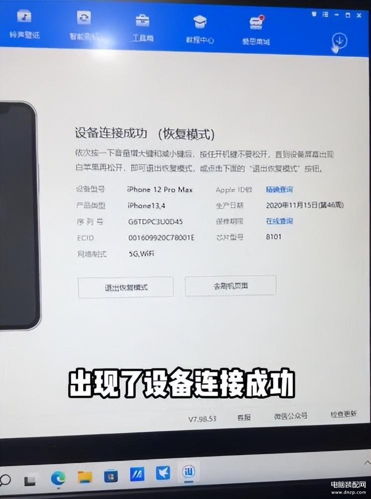 第二步,先将我们的苹果手机关机,用数据线将它和电脑连接在一起。接着按住关机键不松开,手机屏幕出现苹果手机logo后也不要松开,直到出现一个数据线+小箭头+电脑屏幕这个图案的时候,再松开。这个时候,我们看一下电脑端页面:设备连接成功,已经进入到了恢复模式。