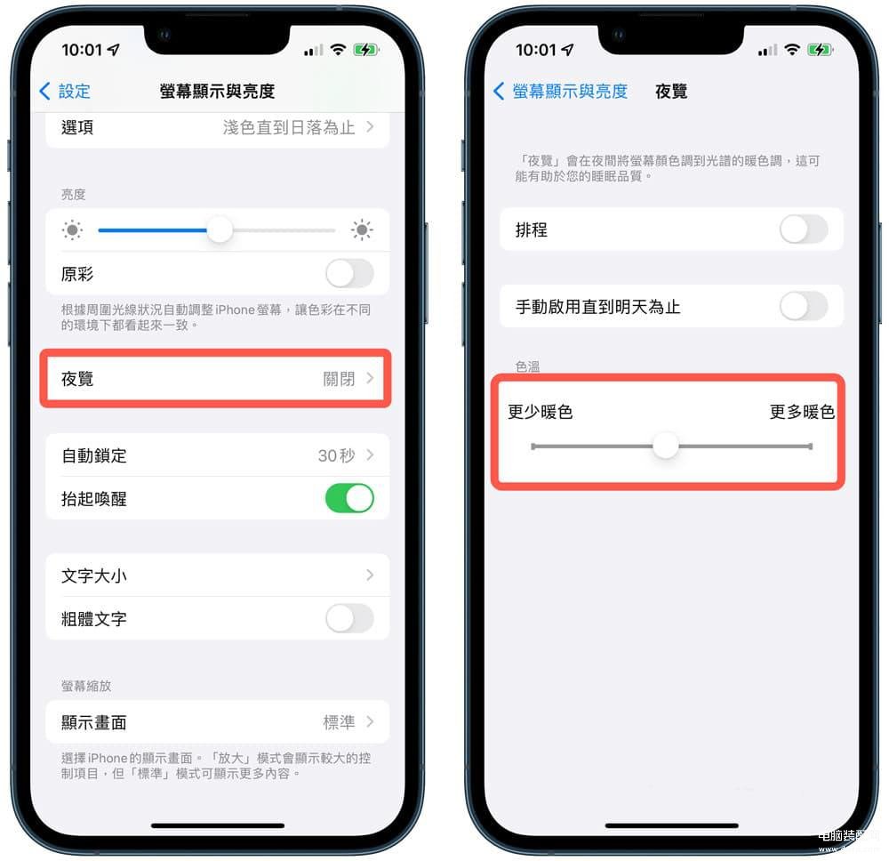 iPhone夜览功能设定位置:可以透过【设定】>【屏幕显示与亮度】内点选【夜览】,将最下方色温调整到中间值,屏幕就能回到原本正常色温。