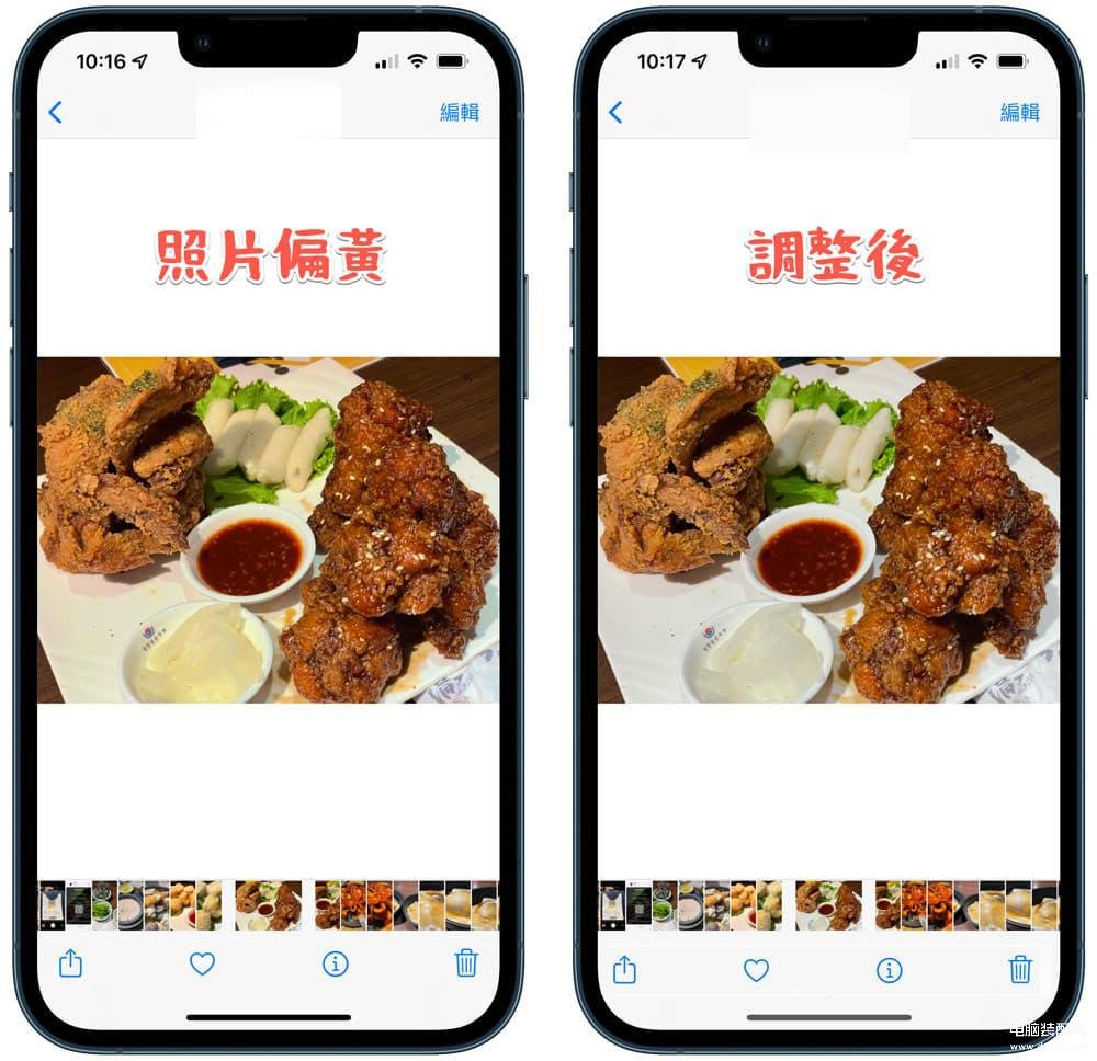 底下左图会发现iPhone拍出来的照片偏黄,经过后期调整色温和色调后,就能立即改善照片偏黄问题。额外提醒要调整色温时,还是要记得检查原彩和夜览是否有关闭。