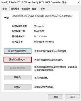 2、随后打开带有“SATA AHCI”的控制器属性,切换到驱动程序选项卡,点击“更新驱动程序”。如图所示: