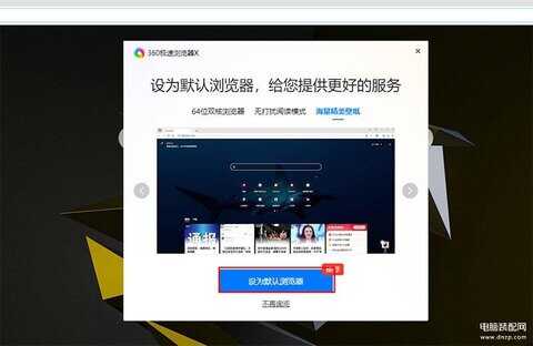 (1)打开360极速浏览器,如果还没有设置它为默认浏览器,那么一打开就会显示,【设为默认浏览器,给您提供更好的服务】的弹窗,我们直接点击下面的【设为默认浏览器】的按钮,就直接将360极速浏览器设置为默认浏览器了。