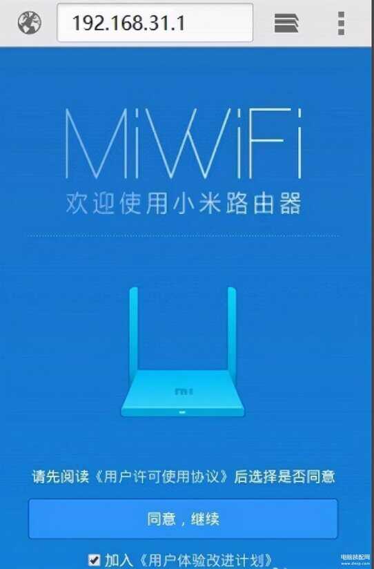 2、打开手机或电脑上的浏览器,在地址栏输入miwifi.com或192.168.31.1,进入到首页,点击同意进入到下一步配置。