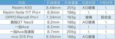 提及对手感的影响,除了手机够薄够轻外,手机后壳和中框材质也是一个关键因素。总得来看,vivo S15 Pro、OPPO Reno8 Pro+、真我GT Neo3以及Redmi K50都采用了玻璃后盖,其中OPPO Reno8 Pro+还加入了金属中框。