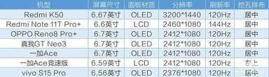 最后我们来看看屏幕,从材质来看,七款机型中除了Redmi Note 11T Pro+和一加Ace竞速版使用LCD屏幕外,其余五款机型无一例外都选择了OLED屏幕,都支持最高120Hz的屏幕刷新率。Redmi K50还提供了2K分辨率,观感上更加细腻。屏幕尺寸上,7款机型都处于6.6到6.7英寸之间,尺寸差距不大。另外,七款手机都采用了直屏设计,直屏的好处不言而喻,除了防误触以外,玩游戏也更顺手一些,对于手游党而言,算是一个不错的选择。