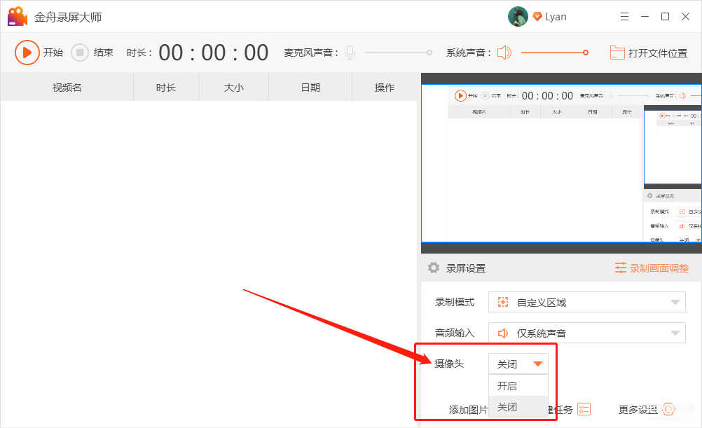 4、其中,也可以选择开启摄像头录制,如果有需要的话;