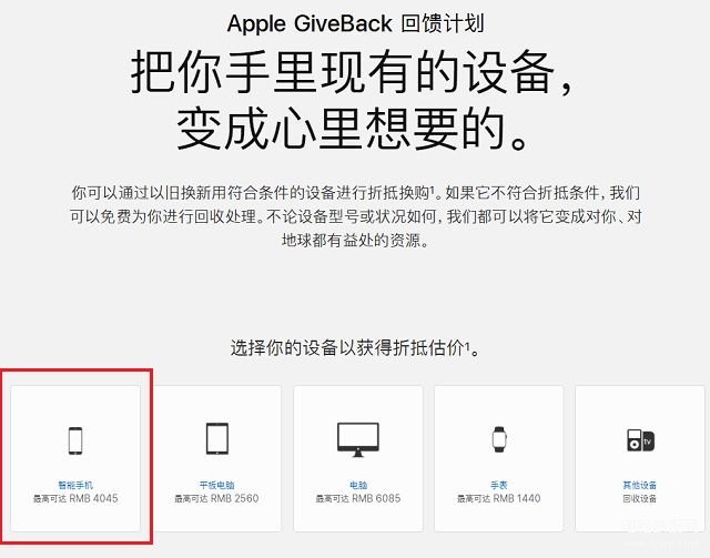 1、首先打开苹果官方的Apple GiveBack 回馈计划(以旧换新)活动页面网址,然后选择“智能手机”,如图所示。