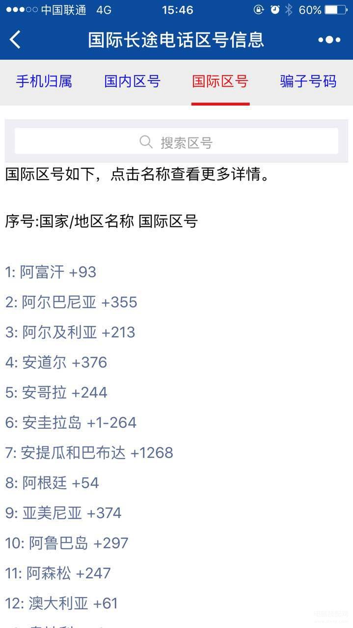 2、国内区号和国际区号菜单项下方都增加了搜索功能,输入区号号码就可以显示搜索结果。