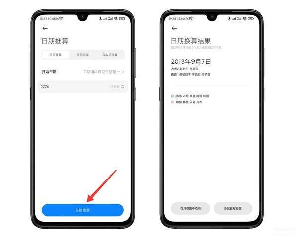 打开日历,点击右上角三点菜单,选择“日期推算”,开始时间默认选择为当天,下面一栏输入天数,后面一栏选择为“往前推”。