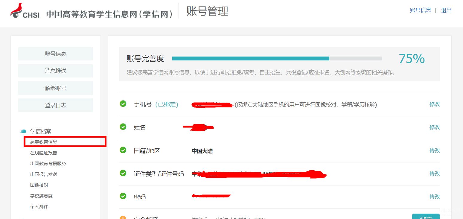 第四步:进入主页面后点击左侧学信档案里面的高等教育信息: