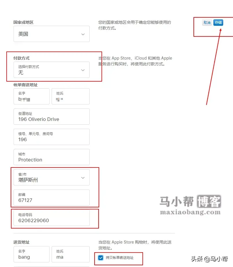 下面的送货地址直接勾选拷贝账单寄送地址,然后点击右上角的存储按钮。