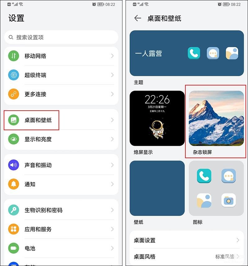 首先我们得先将自己喜欢的照片设置为手机锁屏。点击手机的【设置】-【桌面和壁纸】,然后选择【锁屏杂志】。