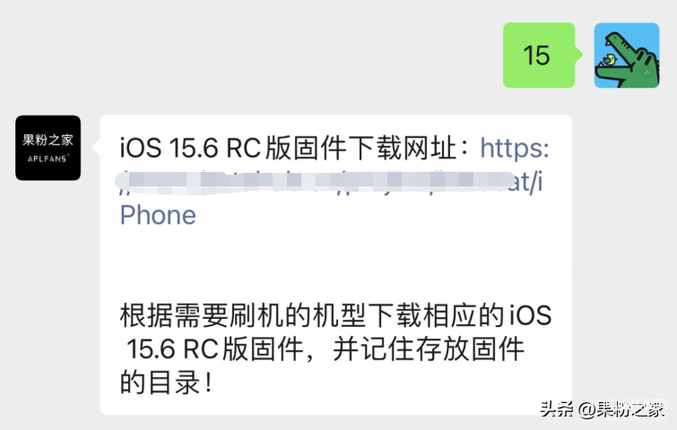 备份完成后,我们就可以去下载iOS 15.6 RC版的固件准备刷机了。记住:是iOS 15.6 RC版哦!固件下载网址可在:果粉之家 回复“15”获取,用户可根据自己的机型选择下载相应固件。