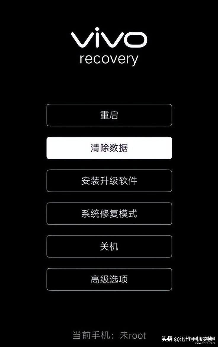 2.选择“进入recovery”。这里要提醒大家的是,recovery模式下屏幕是不可以操作的,但可以通过按音量的上下键移动光标,按电源键去确定选项。
