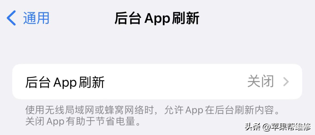 打开手机「设置」-「通用」-「后台App刷新」,点击进去后,选择关闭即可。在此功能页面,也可以看到,官方有提示文字“关闭有助于节省电量”。