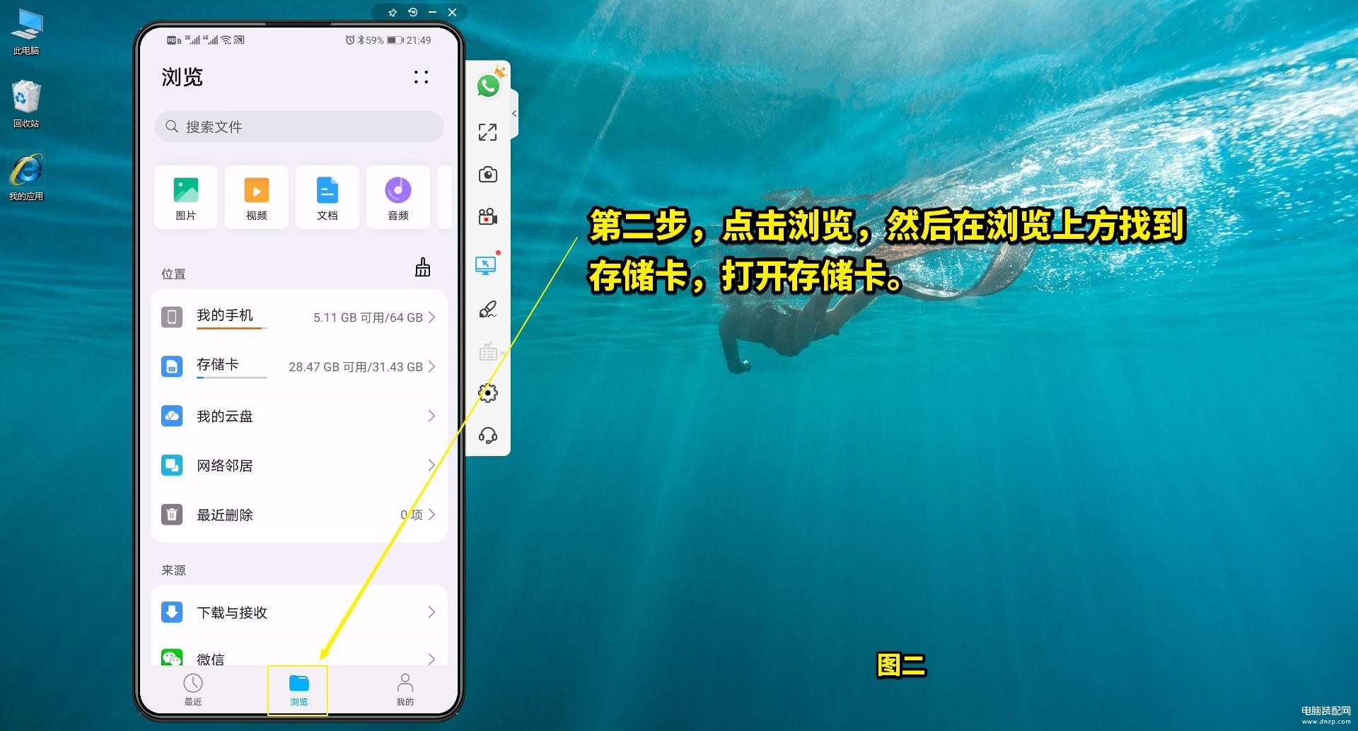 第二步,打开文件管理,点击浏览,然后在浏览上方找到存储卡,打开存储卡,具体看图二。