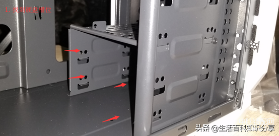 固定硬盘和螺丝固定方式略有不同。首先,打开机箱两侧的面板,找到靠近主机箱前面板的硬盘插槽。卸下支架后,先将硬盘固定在支架上,然后将支架插入硬盘槽中。 (如图)