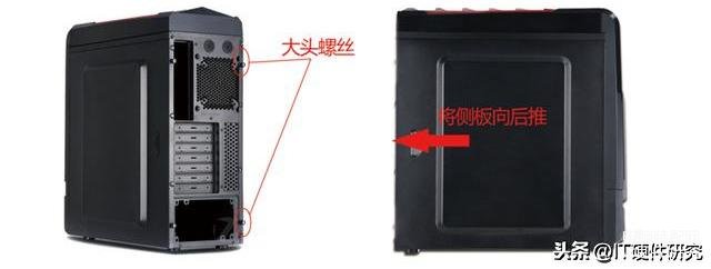 1. 将机箱竖直站立的放置在桌面上,面朝机箱后面板(键鼠,USB,网线接口处),取下机箱后面板右侧上下的两颗大头螺丝,将机箱右侧的侧面板向后拉,即可取下右侧面板。