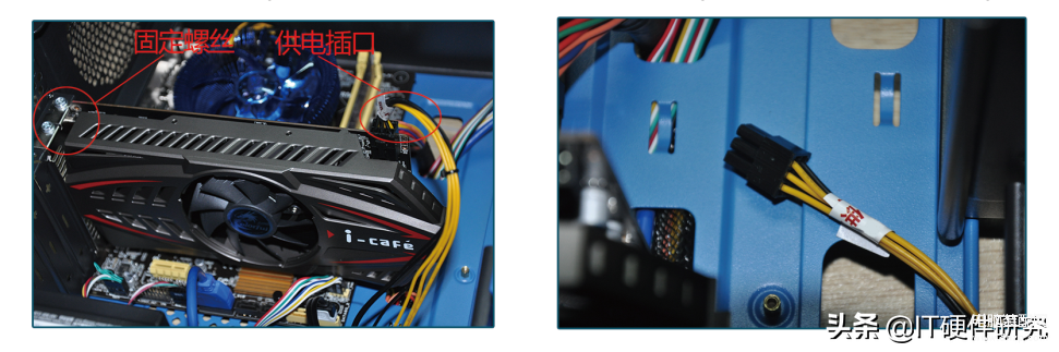 4. 将显卡用螺丝固定后,找到放置在机箱内部的显卡供电接头(一般为一个6孔或两个6+2孔,且上面贴有标签),并将它插在显卡尾端的供电插口上(下面以6孔显卡供电为例)。