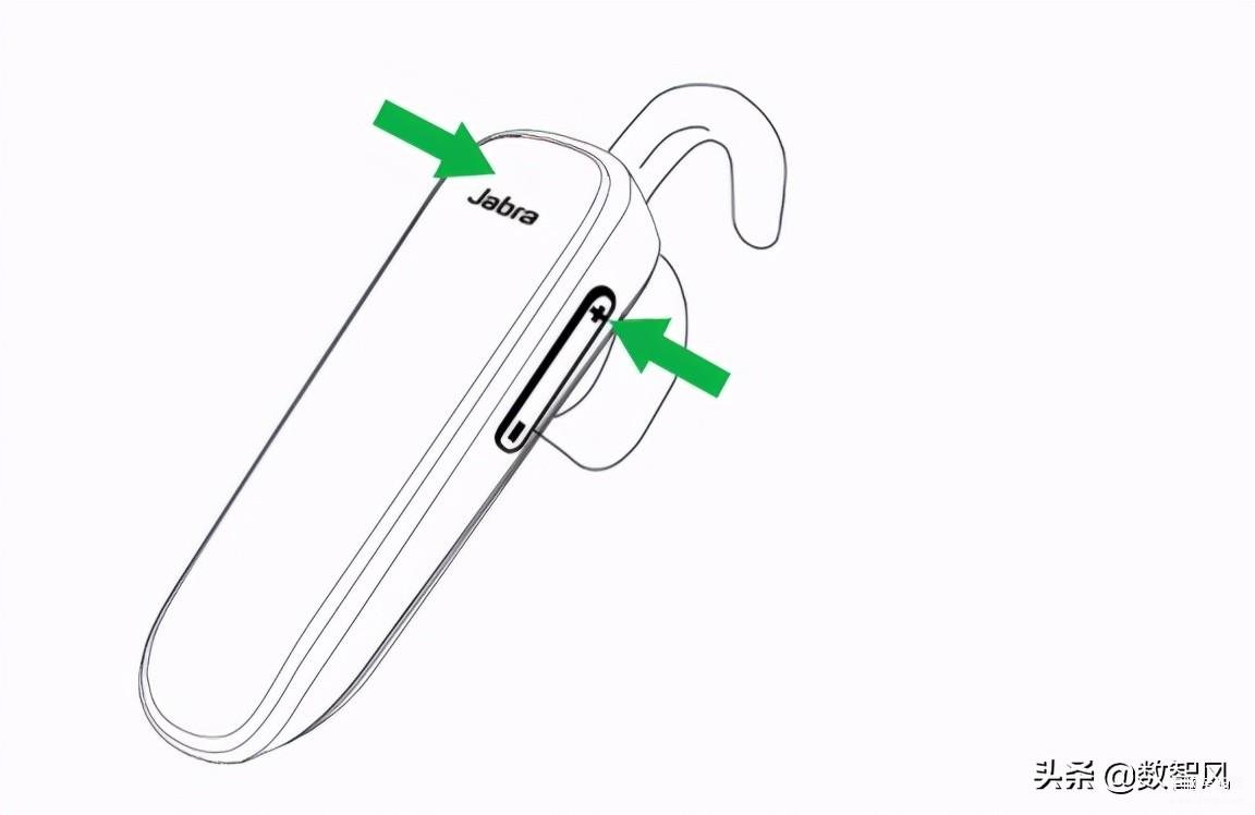 ①、将Jabra Boost开关向上滑动到“开启”状态(电池图标侧)。同时按住音量+按钮和多功能按钮(jabra文字) 5 秒钟,直到电池和蓝牙指示灯闪烁。