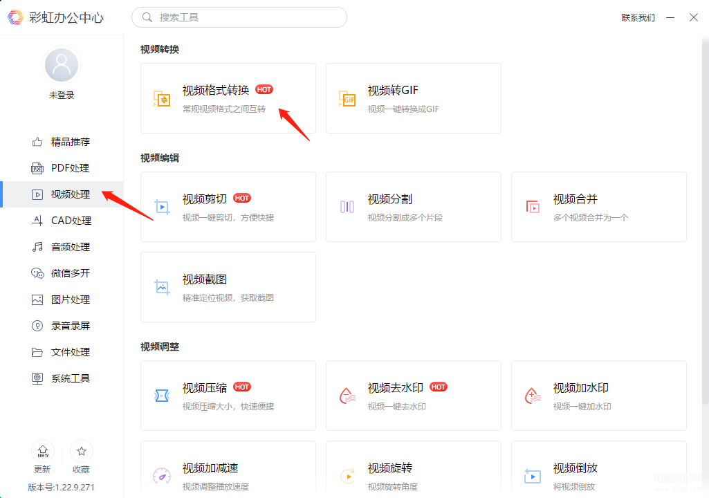 大家在打开了彩虹办公中心之后,首先需要来寻找视频的处理的部分,这里拥有的功能还是很丰富的,我们来到“视频处理”的部分之后,再通过视频转换当中的“视频格式转换”,进行一个视频格式的处理。
