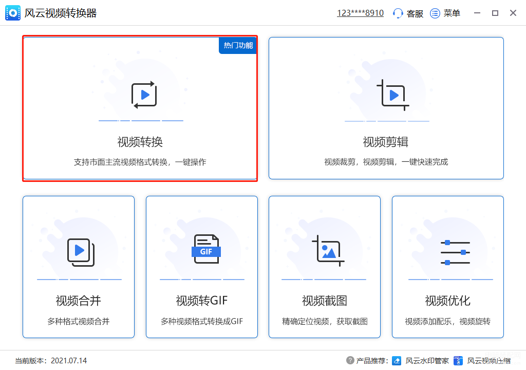 首先我们需要来下载风云视频转换器,下载完成之后,打开风云视频转换器,就可以看到首页上有着很清晰的功能的划分,这里我们只需要选择第一个“视频转换”的热门功能项就可以来进行编辑了。