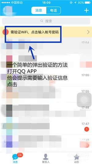 首先,打开手机QQ ,会发现在界面上方有提示“需验证WiFi,点击输入帐号密码”;