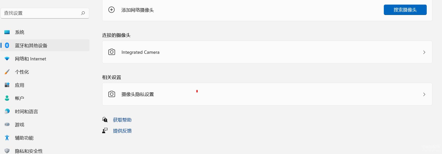 进入计算机设置界面之后,点击左侧菜单栏中的【蓝牙和其他设备】,接着选中右侧的找到下方的【摄像头】点击进去