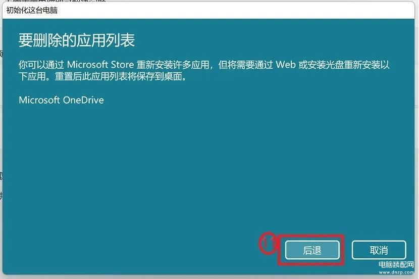 10.重置电脑时,将会删除您的应用程序。以下将会列出无法透过Microsoft Store重新安装的应用程序列表,您需要从网络或是安装光盘重新安装下列应用程序。请点【后退】⑪并继续下一个步骤。