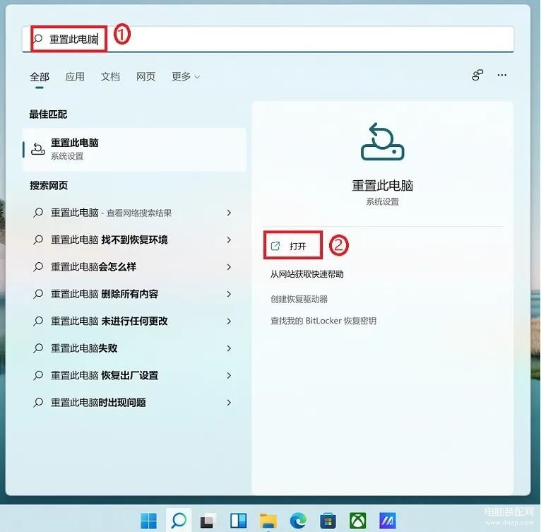 1.在Windows搜寻栏输入【重置此电脑】①,然后点选[打开]②。