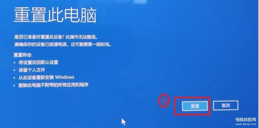 6.点击【重置】⑤,电脑将会开始重新安装Windows。