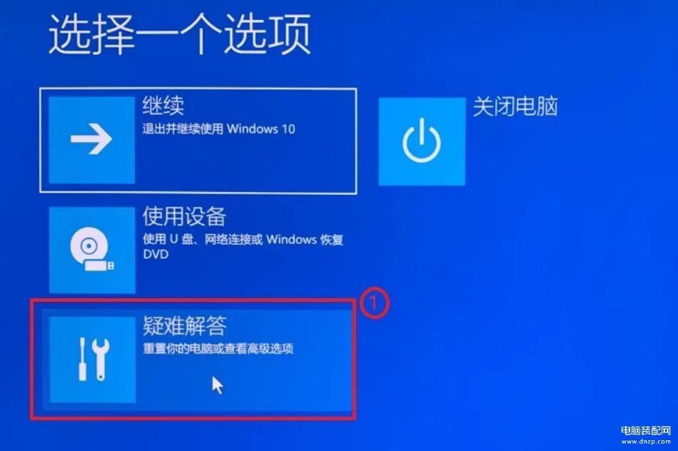 1.Windows修复环境,了解更多如何进入Windows修复环境。2.Windows修复环境后,选择【疑难解答】①。