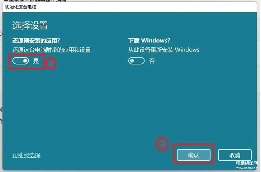 6.将【还原预安装的应用】设定为开启⑦,然后点选【确认】⑧。