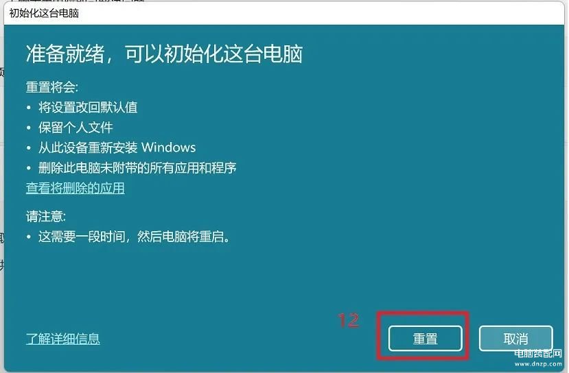 11.点选【重置】⑫。系统将会开始重新安装Windows 11,安装完成将会重新启动。