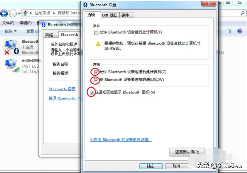 6、在连接下边,把三个选项都打钩:【容许Bluetooth机器设备连接到此计算机】、【新Bluetooth机器设备要连接时告知我】、【在通告区域显示Bluetooth图标】。