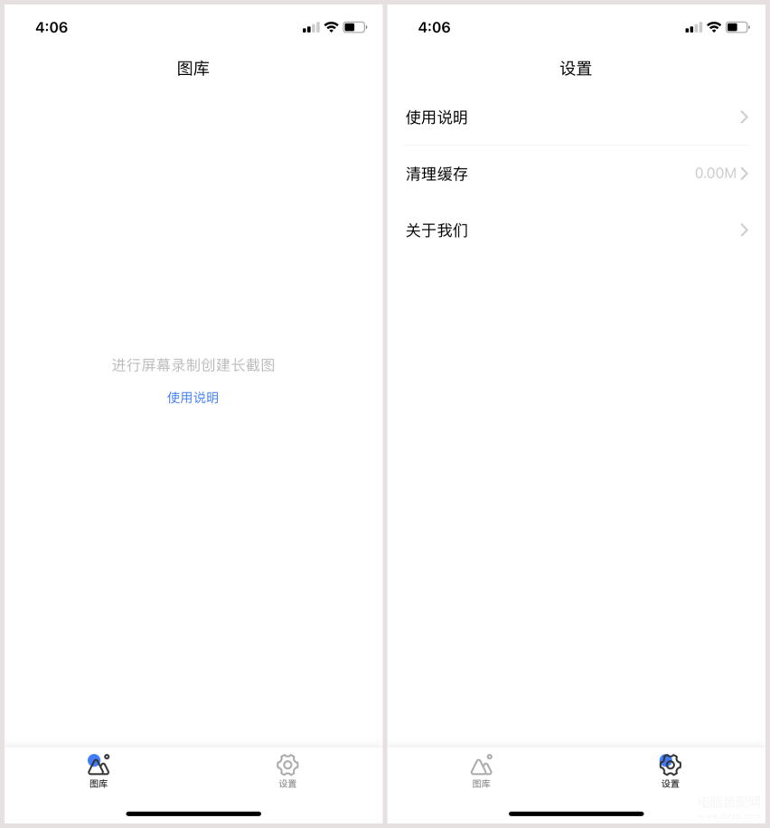 应用界面异常简洁,只有一个用于浏览导出长截图的「图库」,剩下的就是设置了。功能上"滚动长截图"采用录屏的方式完成长截图操作,省去了手动逐张截取再逐一选取合成的过程。
