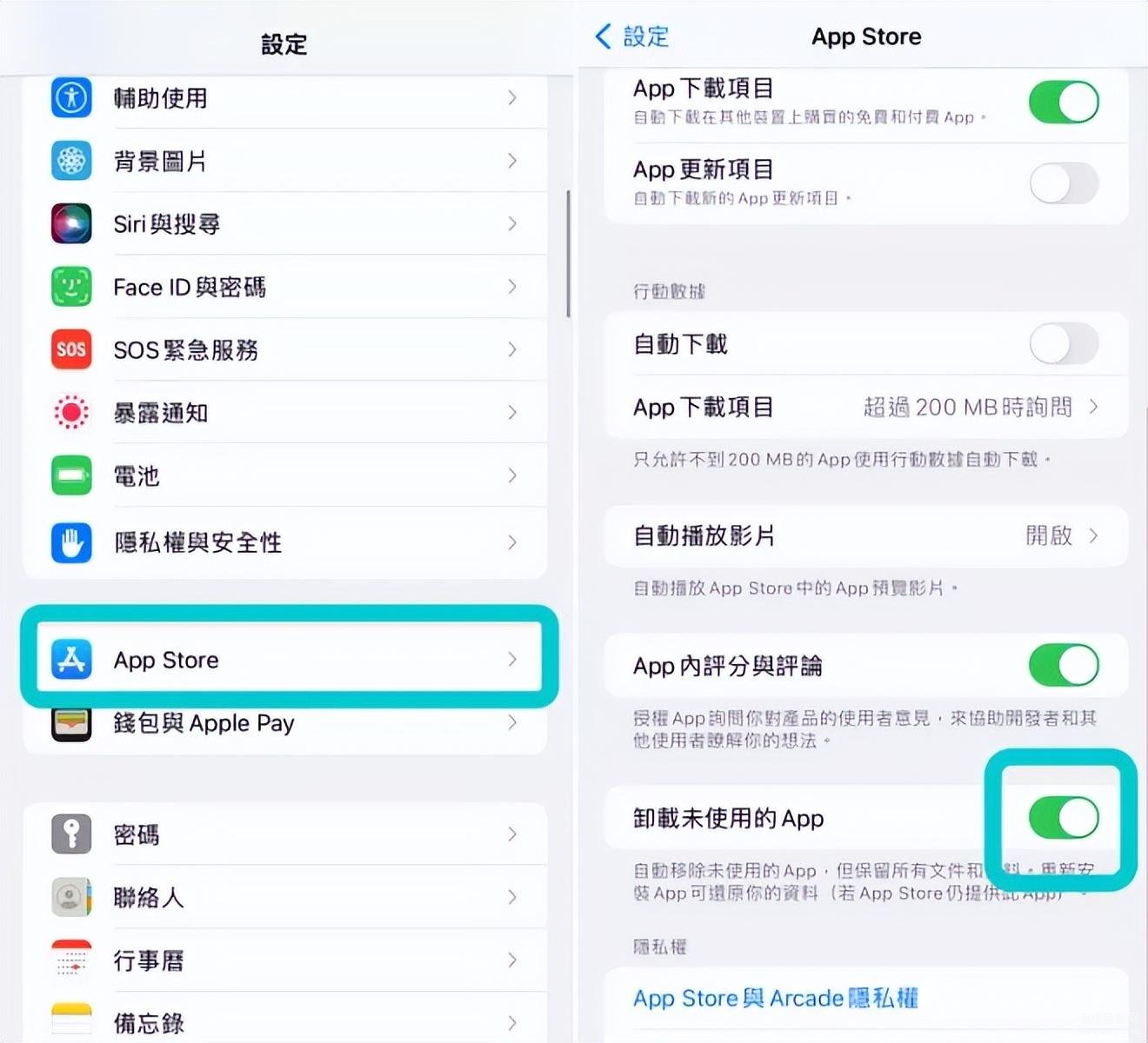 卸载App有自动与手动两种方式,自动卸载功能可以去「设定」>>「App Store」>>「卸载未使用的App」选择开启,如果未来想要关闭这个功能也是一样的路径。