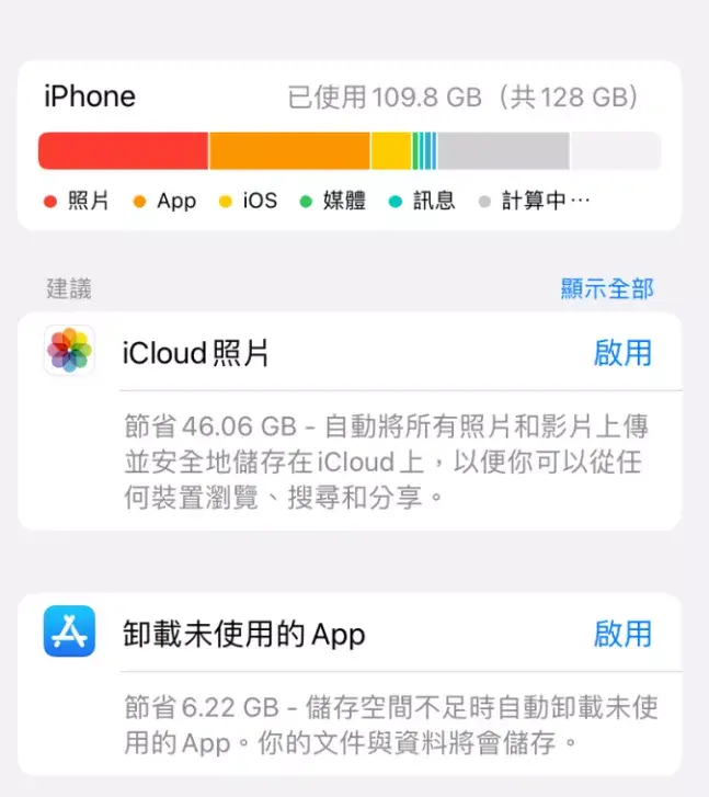 或者你去「iPhone储存空间」页面,手机也会建议你启用这个功能,直接按「启用」即可,如果没有看见「卸载未使用的App」,可以试试看在「建议」右边点选「显示全部」
