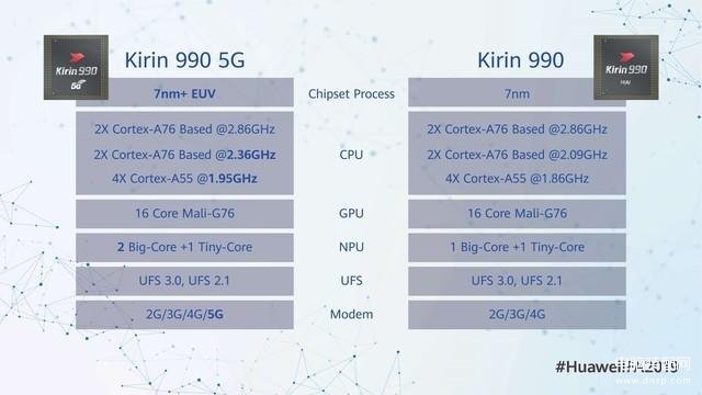 当然,需要特别提示的是,麒麟990系列一共分为两个不同的版本,分别为:麒麟990 5G和麒麟990。其中麒麟990 5G采用7nm+ EUV工艺制程,麒麟990采用7nm工艺制程。不难猜想,这两款芯片将会分别对应全新Mate 30系列中的不同型号。