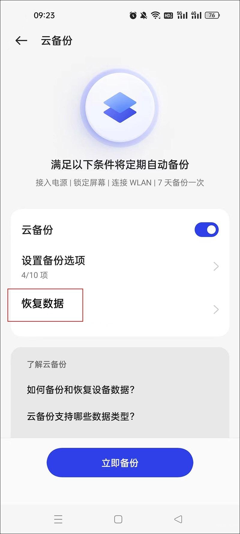 回到云备份页,点击【恢复数据】,然后根据步骤提示选择我们想恢复的内容,点击【立即恢复】就可以立马恢复。为了避免数据出现异常导致覆盖现有的聊天记录,建议大家先将手机里的数据备份到电脑后再进行此操作。