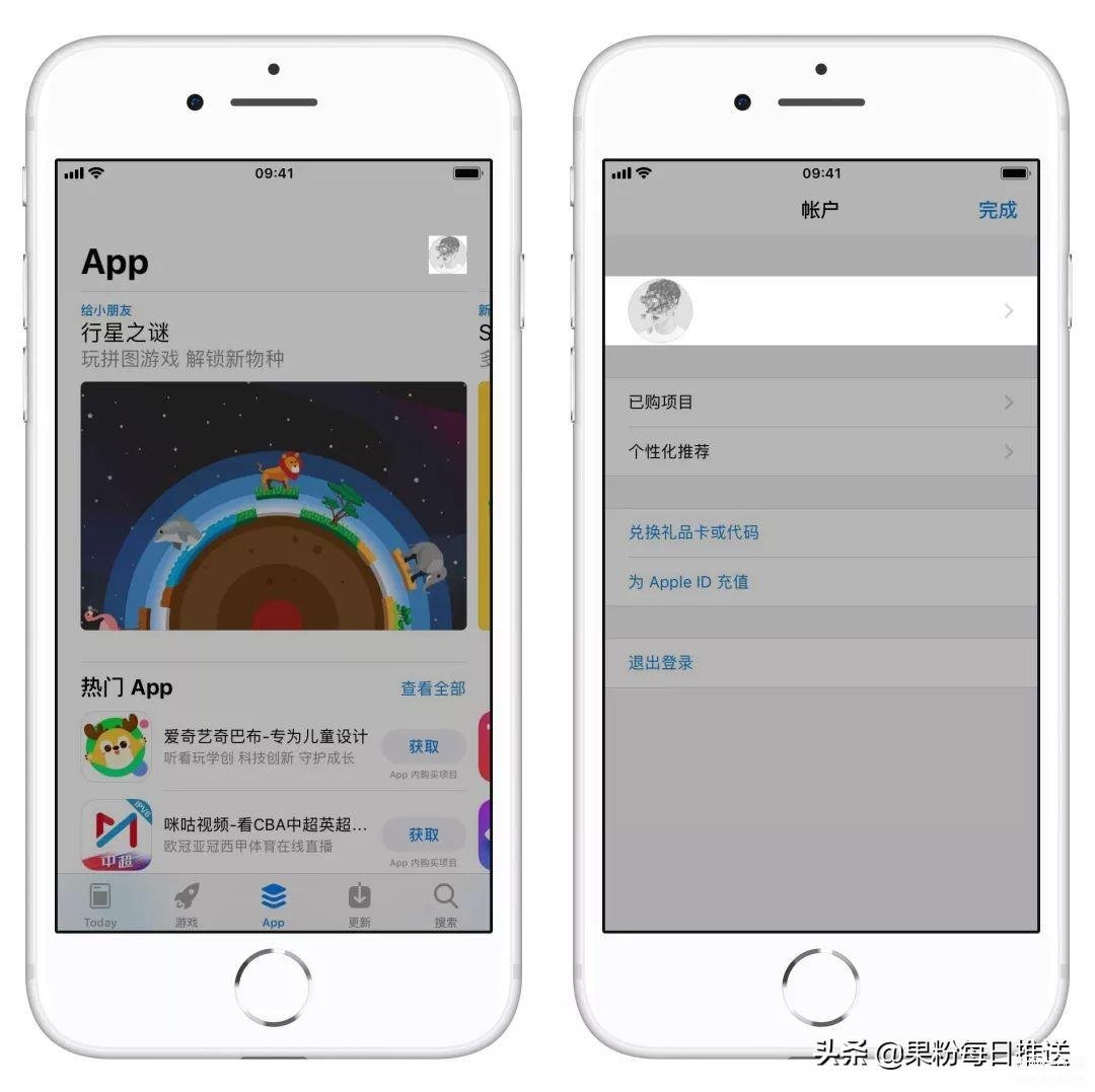 ● 前往 App Store,轻触右上角个人资料,进入管理页面后轻触顶端的个人资料