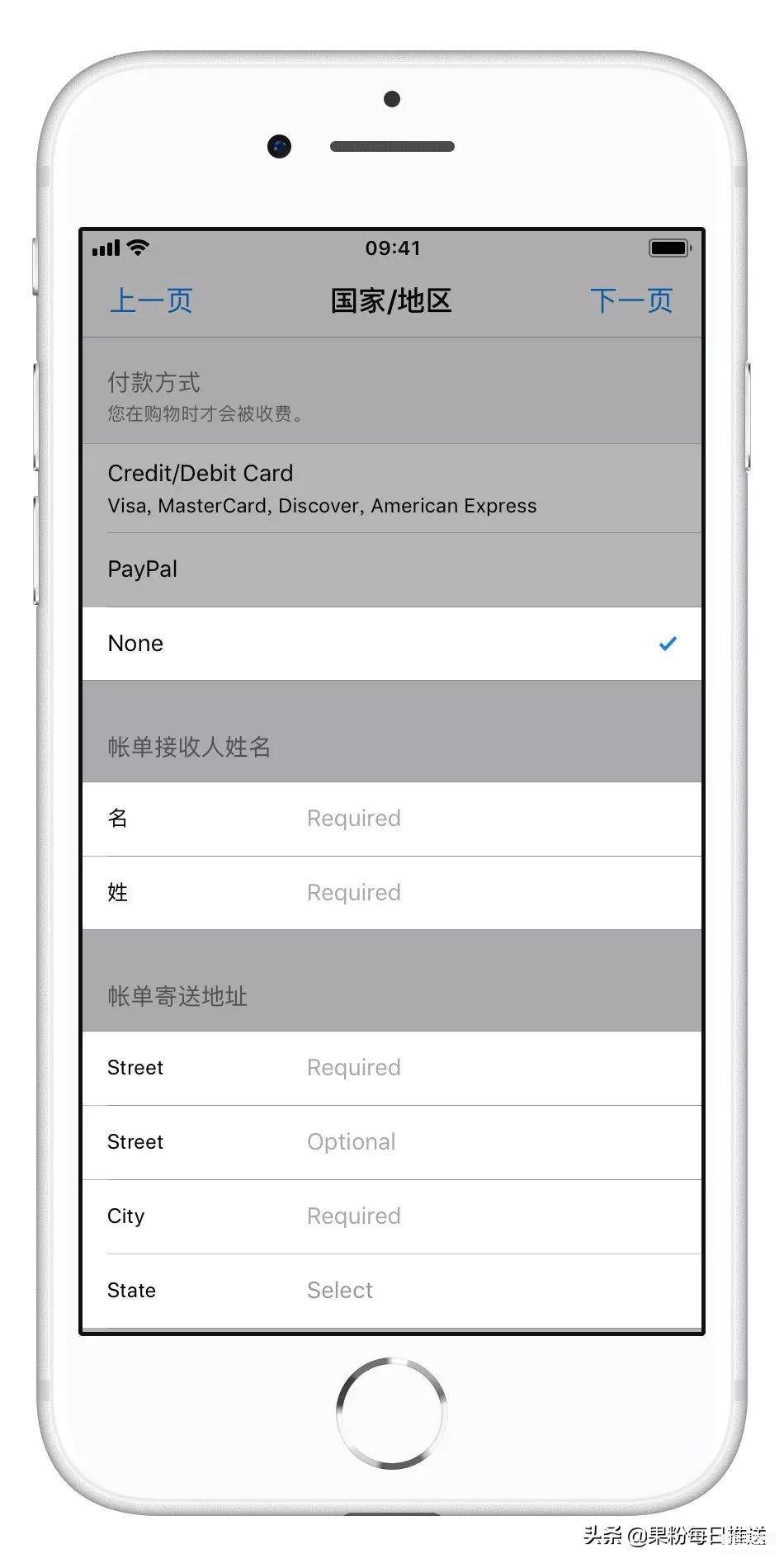 在付款方式中选择「None」(非科学上网环境下无此选项),并填写「账单接收人姓名」及「账单接收地址」相关信息,由于我们选择了「无」付款方式,可以前往搜索引擎搜索并填写上述信息,填写完成后,轻触「下一页」,即可完成地区更改。